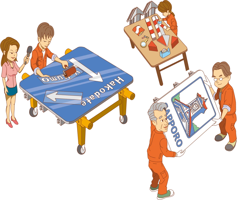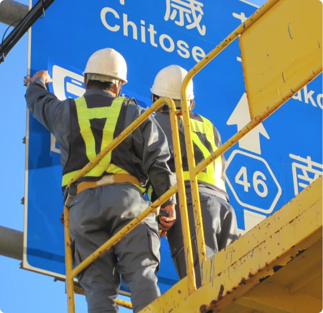 私たちは現場第一主義を掲げ、北海道の道路標識メーカーとして道路標識の設計・製造・工事を手掛けると共に、道路標示・区画線の工事業者としても道路の安全に寄与しております。